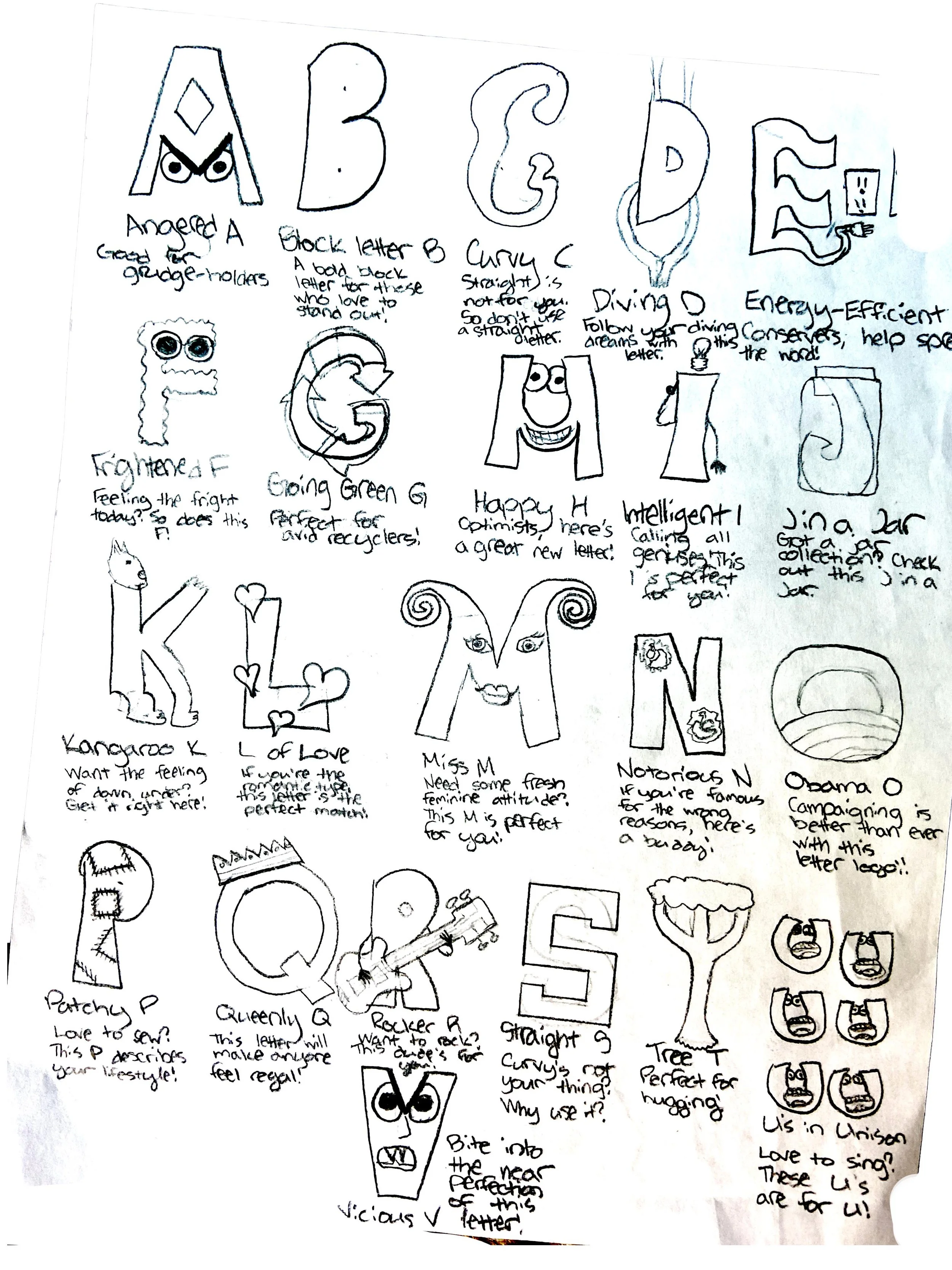 I love alphabets, as you may have discerned. Every year in the classroom I challenged the kids to come up with their own alphabet. We looked a LOT of samples, but, frankly, these creative kids didn’t need that so much. I though I ‘d share one that I found again in my files. The artist is Randi Klinck, who was either a 5th or 6th grader at the time, and could always be depended upon to come up with her brand of creativity. I hope she doesn’t mind this 20-year-old piece being shared with you.
